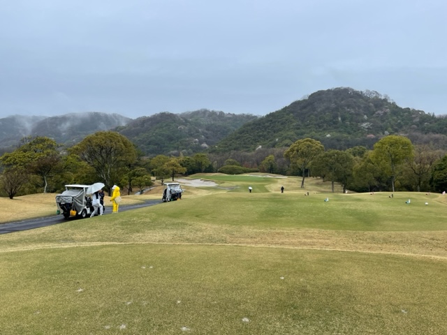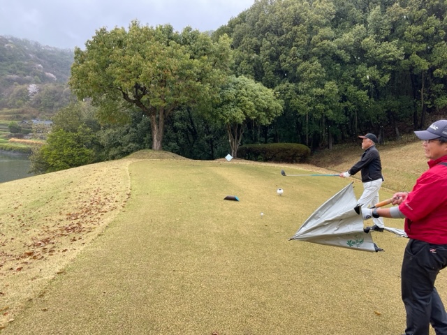 生憎の雨です。今日は前の組の方では月例会が開催されている模様です。合羽を着てスタートします。今日もレギュラーティで進行します。
