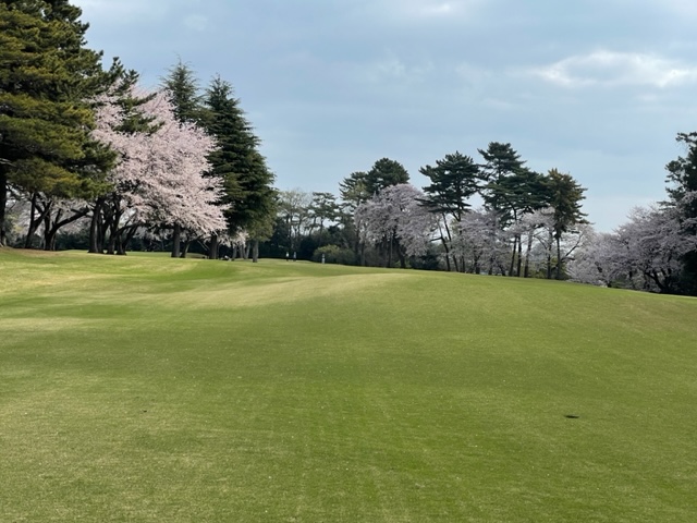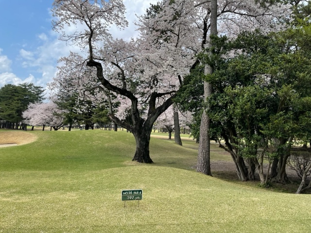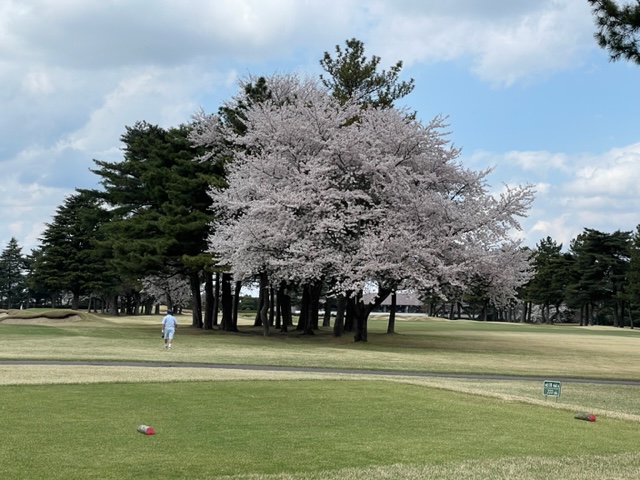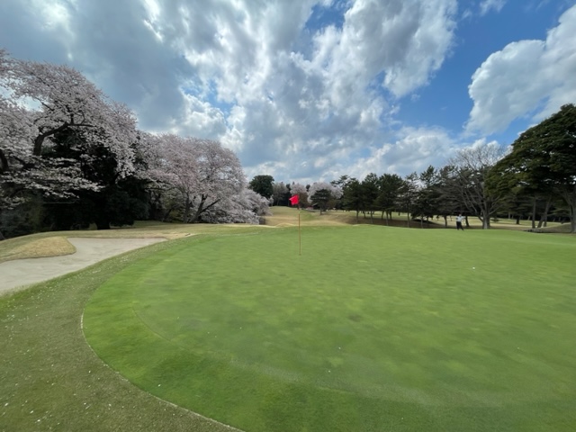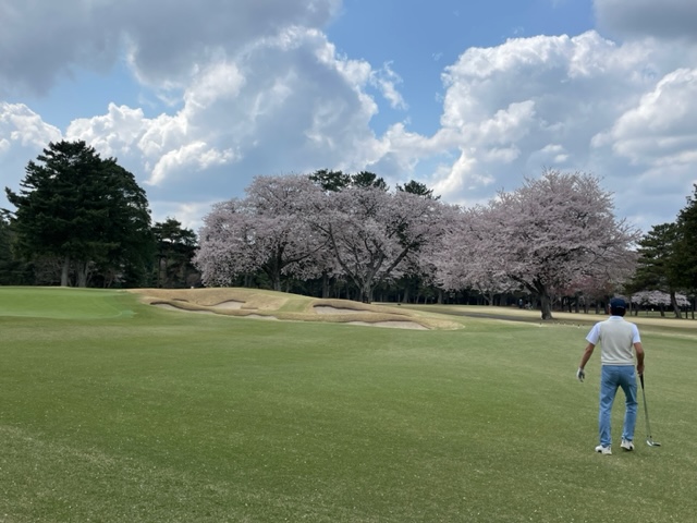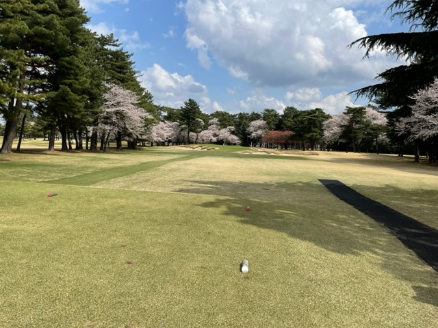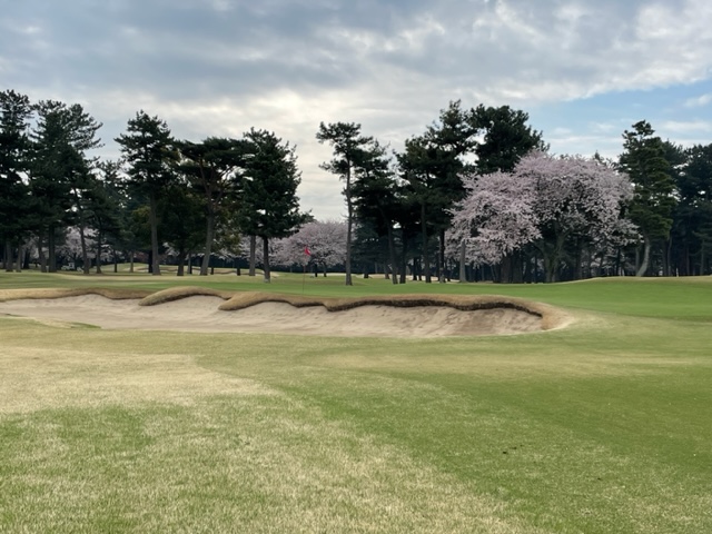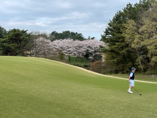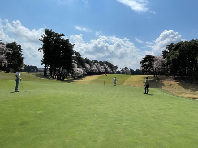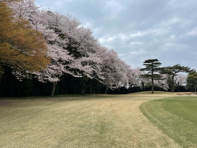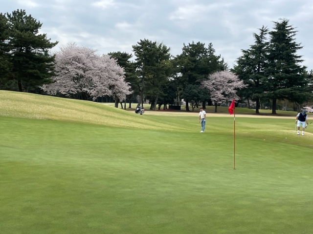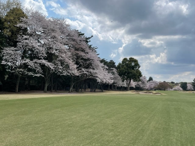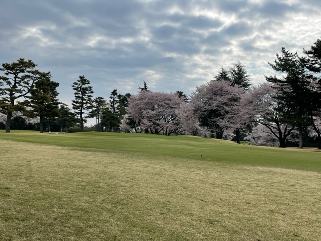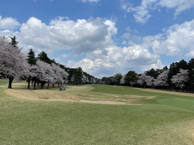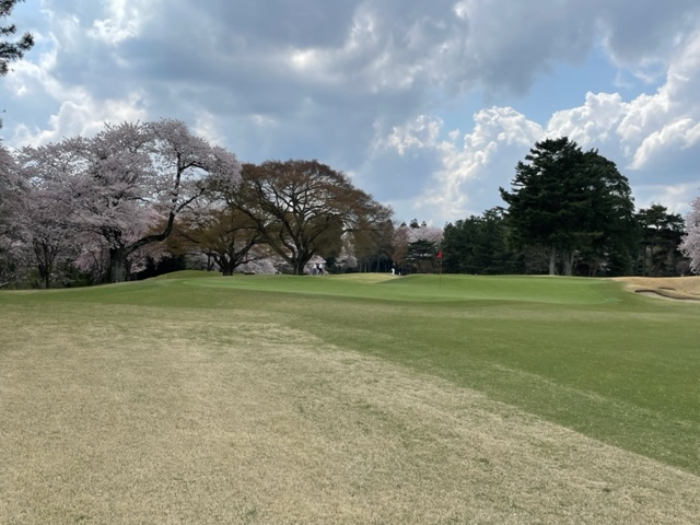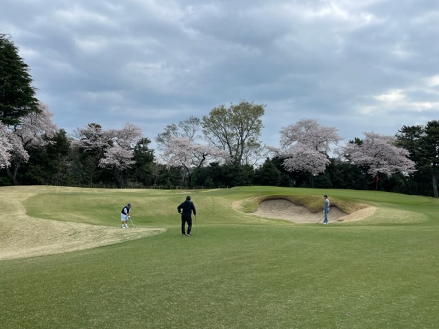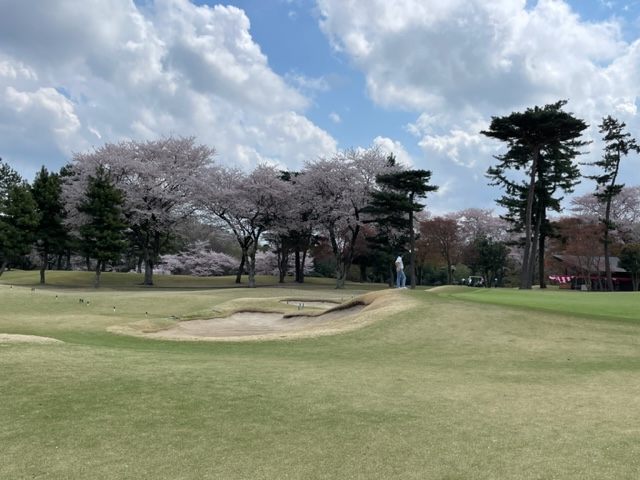 10番493y左ドッグの桜が綺麗なロングは、ドライバーは狙いよりちょいと左でバンカーイン。25度で打つもどダフリ。残り220yから3wで打つも左手前のバンカーイン。ここからナイスアウトで1.3mに4オン。で、これを外す。アホ。しっかり3オンのS.Tさんが無難にパー。