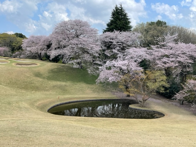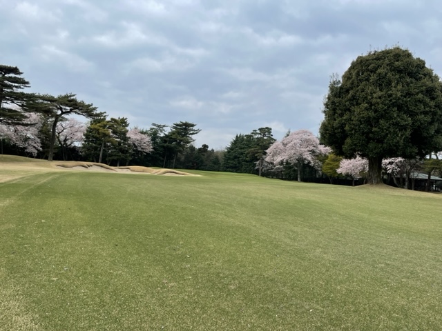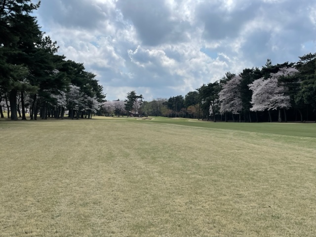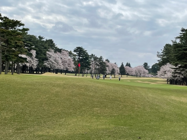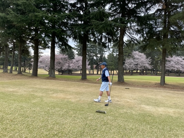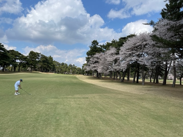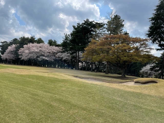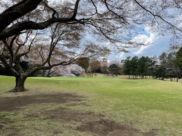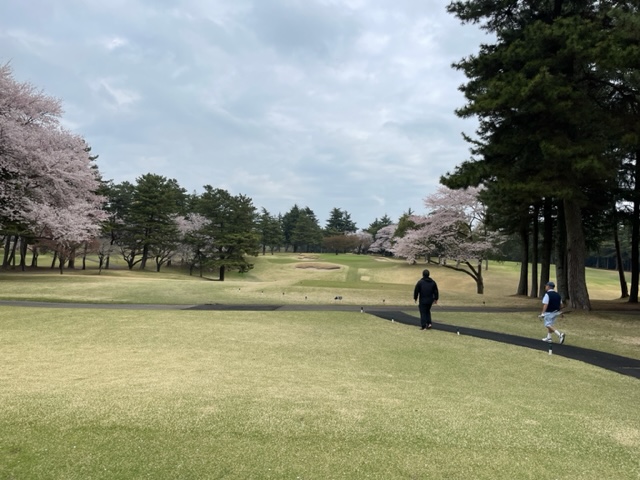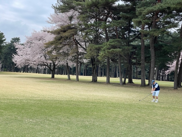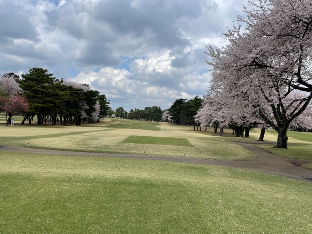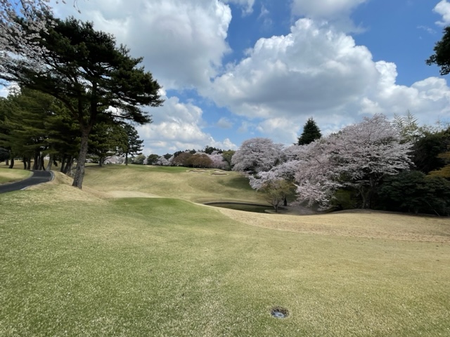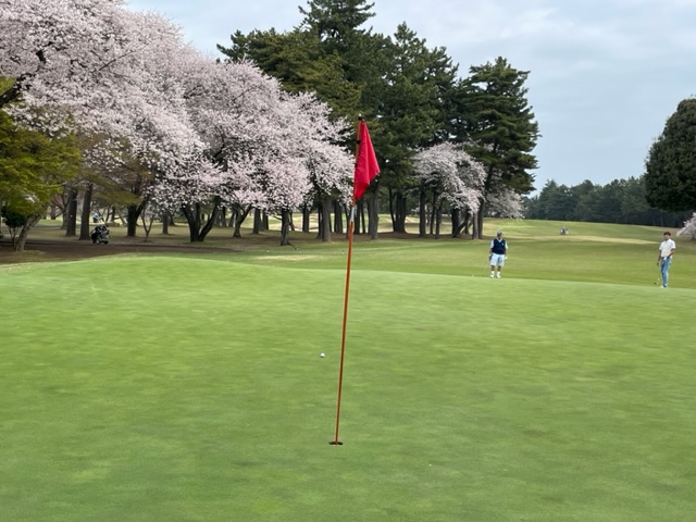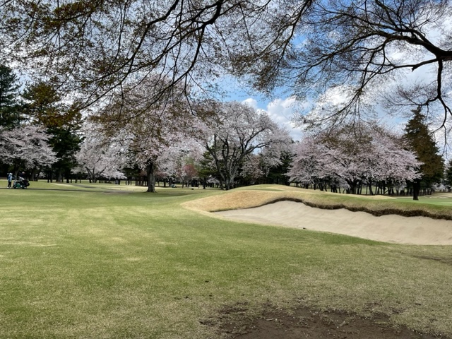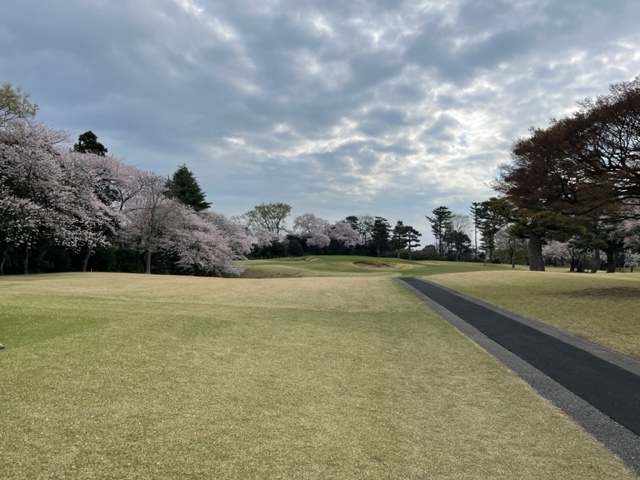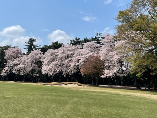 10番493y左ドッグの桜が綺麗なロングは、ドライバーは狙いよりちょいと左でバンカーイン。25度で打つもどダフリ。残り220yから3wで打つも左手前のバンカーイン。ここからナイスアウトで1.3mに4オン。で、これを外す。アホ。しっかり3オンのS.Tさんが無難にパー。
