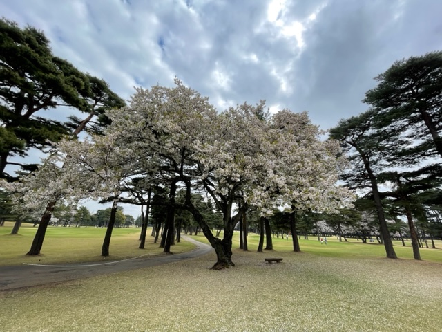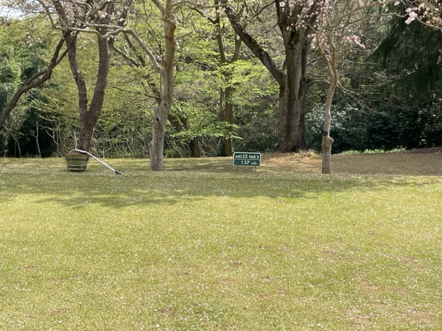 13番桜が綺麗な134yショートは、9アイアンで打つも左へ。ここから世界のM.Mさんにスライスするよーって教えてもらい、56度で打つと、これまたスルスルとカップイン。驚いた~。しっかり1オンさせていたS.Tさんが無難にパー。