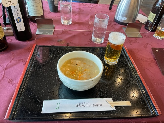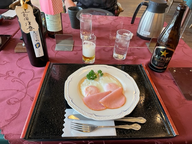 まずは、忘れていた帽子(これってきっと前田さんのじゃないか?と皆が言ってまして・・・)お渡しいただき、着替えてレストランへ。すでに縁の面々がおられましたので、ご一緒させていただきます。朝も売店も茶店もドリンクがフリーとのことで、黄金水をいただくことに。とハムエッグと豚汁とを。