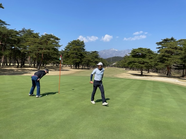 9番484yロングは、ドライバーは右のバンカーイン。8アイアンで脱出。3uで打つも右へ。寄らず入らず。見事な3オンからK.Mさんが無難にパー。ナイスパター力でSさんが銅パー。ナイスアプでN.Yさんが鉄パー。