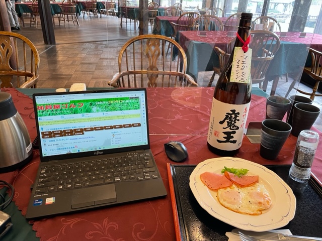まずは、着替えて、レストランへ。ハムエッグを食しながら、独りミーティングです。で、途中、少々お仕事です。9時過ぎになりましたら、皆様がご来場。数名でミーテイングです。私は〆の豚汁もいただきます。