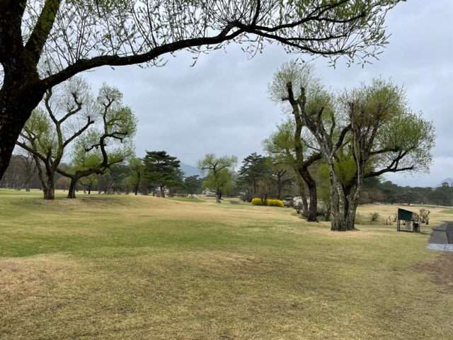 14番350yミドルは、ドライバーは大きく右へ。PWで打つも木に当たる。結局4オンのダボ。見事な2オンからW.Oさんが無難にパー。イーブン。