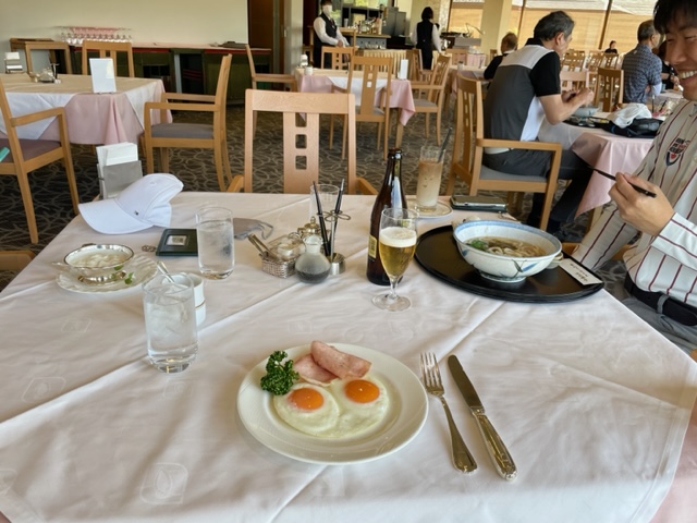 着替えて、レストランへ。メルウェイとテツさんと縁のC.Iさんと朝食タイムです。ハムエッグとうどんを食します。なかなかグー。