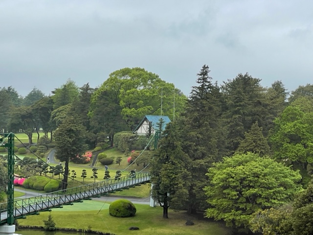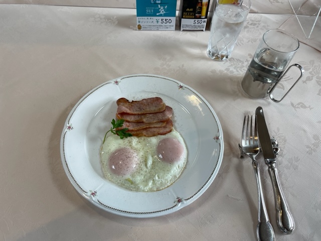 いつものようにレストランでベーコンエッグを食し、珍しくバンカーを3球練習し、打球場で素振りもし、パター練習し、いざ出陣。