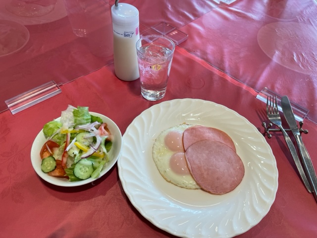 レストランに到着し、ハムエッグを食しながら、独りミーティングの手筈が、、、、。今日はダメなんです。。。。ガクッ。