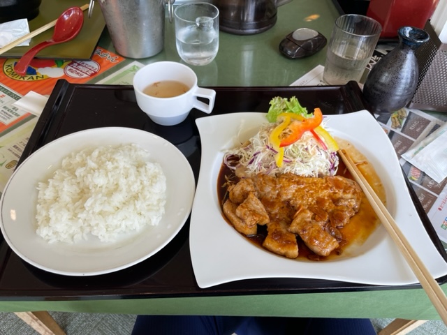 ランチはトンテキとイカ焼きと黄金水と焼酎をいただく。まずまず。