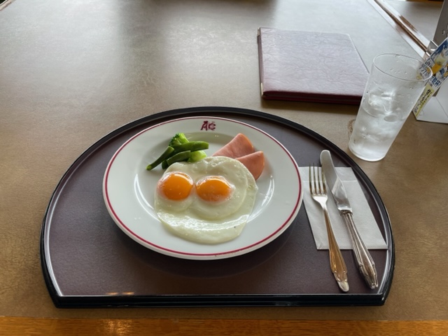 まずは、レストランでべーコンエッグを食しながら独りミーティングです。その後、パターを転がして東インから。インからですが、スコアカードは1番と表示されています。
