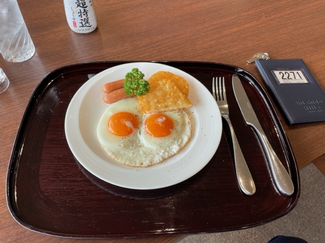 到着後、レストランへ。目玉焼きとウインナーをいただきながら、ミーティングです。時間になり、下に行きます。今日はKGKゴルフ研修会の日です。西を廻ります。
