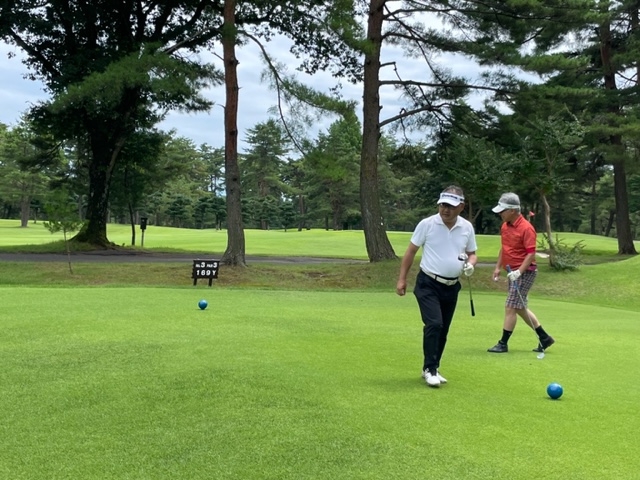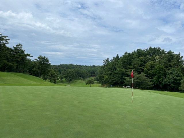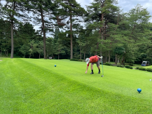 到着後、レストランはやっていないので、コーヒーラウンジで4名ほどでミーティングです。その後、パターを転がして東から。長岡は東西南からなる27ホールゴルフ場ですが、東西は上田治氏設計ですが、南は違うようです。