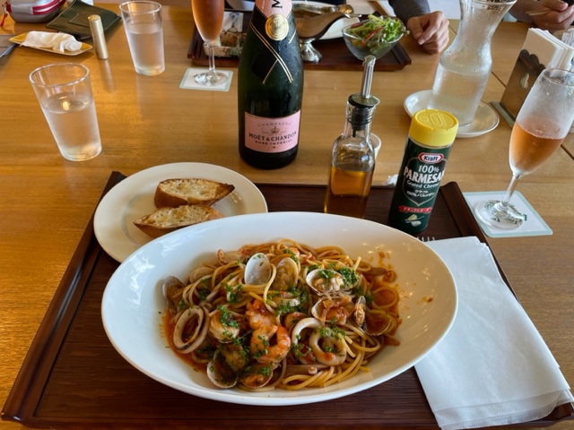 ランチはトマト味の海鮮スープパスタを食す。絶品。