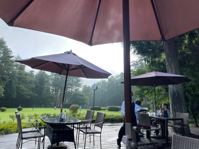 6時半の受付開始とともにコース入り。ここも到着順があるのがありがたいです。今日もテラスで朝食を頂きます。ここのテラス席もなかなかであります。残念なのはキャディがいないこと。今日はB月例の日ですから、特につきません(笑)。
