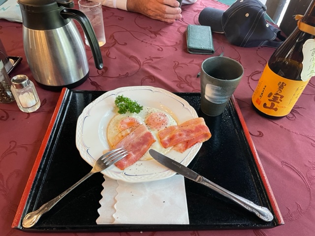 レストランでべーコンエッグを食しながら3人でミーティングです。