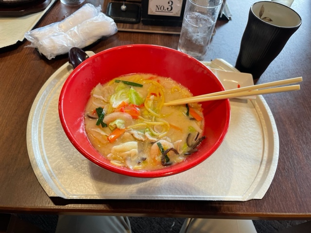 ランチは、お湯割りとチャンポン麺。まずまず。