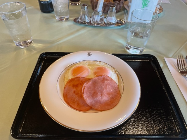 到着後、着替えて、レストランへ。会員のM.Iさんとハムエッグを食しながら二人ミーティング。