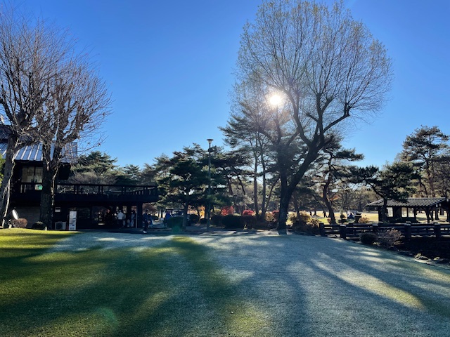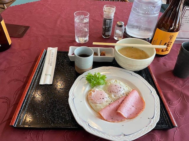 到着後、まずは、着替えてレストランへ。縁の皆様方とトン汁とハムエッグを食し、アウトから。今日は黒ティで進行します。