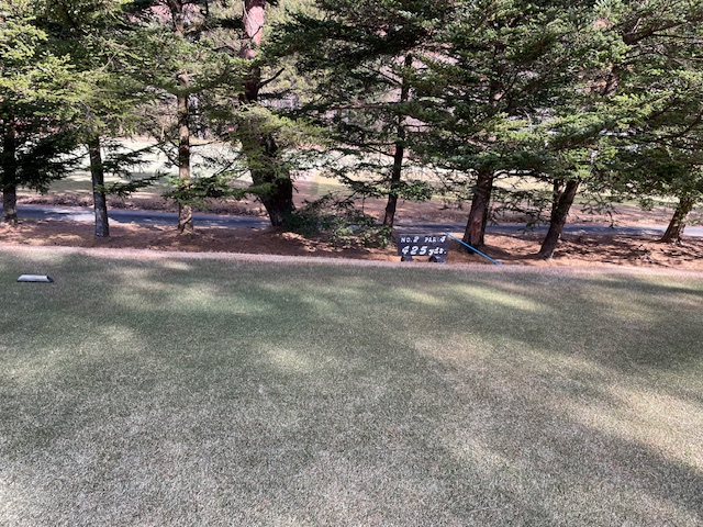 12番ショートは、左へ。暫定球を打つ。初球は発見できず。6となる。ゲボッ。
