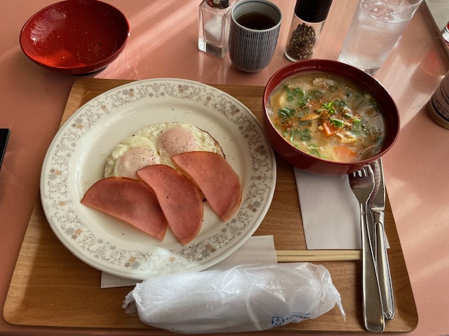 まずは、着替えて、レストランへ。で、数名の方々とミーティングをしながらハムエッグと豚汁をいただきます。