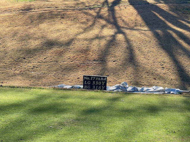 16番ショートは、左へ。ややこしい位置から乗らず。やっとのボギー。