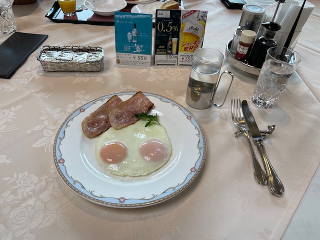 中山に到着しますと、縁のチャンプH.Kさんがレストランにおられたので、合流。いつものようにべーコンエッグを食しながら、二人ミーティング。