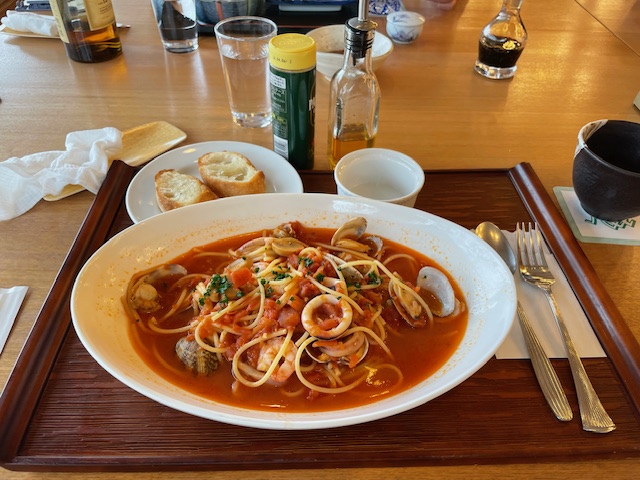 ランチは、トマト味の海鮮スープパスタを食す。美味い!これは最高!
