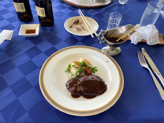 ランチは、つまみとして海老シューマイ、ひねぽん、スパイシー手羽先をいただくも、美味しい!で、最後にハンバーグを食すも、これまた実に旨い!ここは、食事が最高なので接待に最適なゴルフ場。