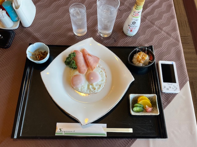 いつものようにレストランへ行き、独りミーティング。今日も素晴らしいい対応であります。で、朝食はハムエッグ和膳とします。