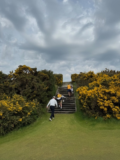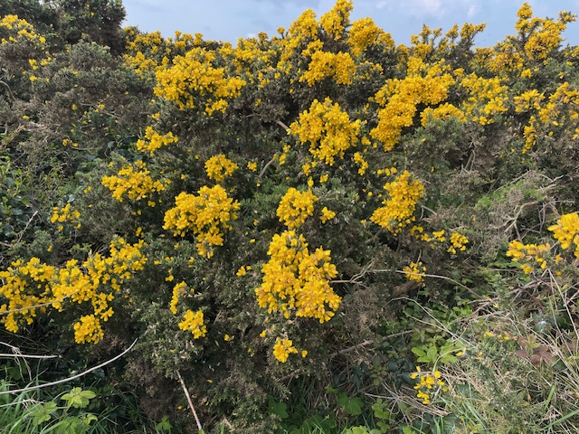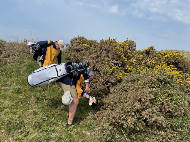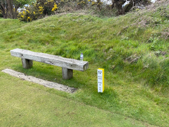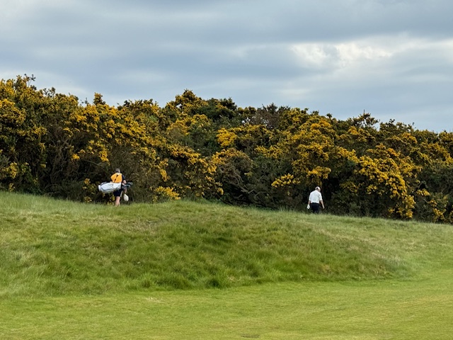 16番300yと短いミドルは、ドライバーは初めて竜巻球。暫定球を打つ。黄色い花が綺麗なゴース(ハリエニシダ)の中に入った模様。4打目がちょいと左へ。結局7となる。今回のツアーで初めて球をなくした。しっかり2オンのS.Mさんが無難にパー。