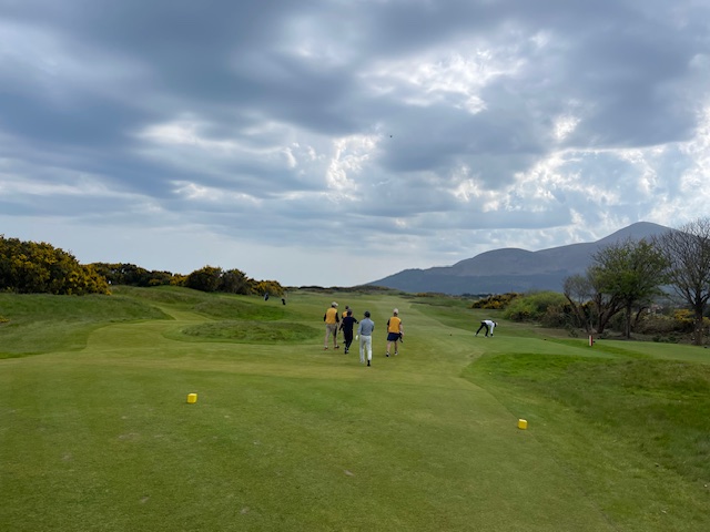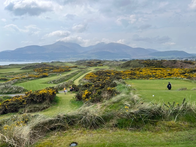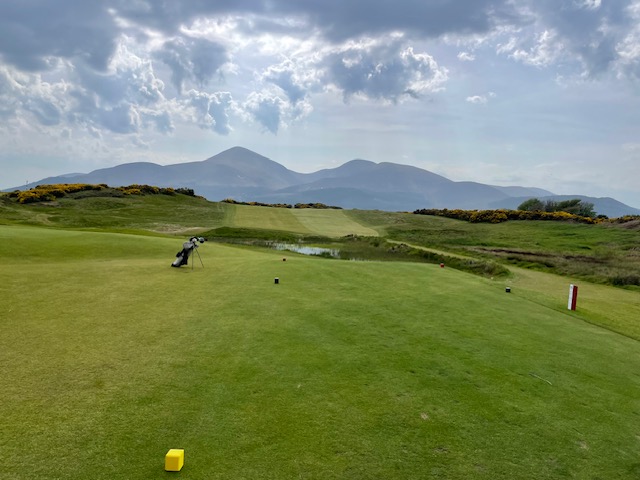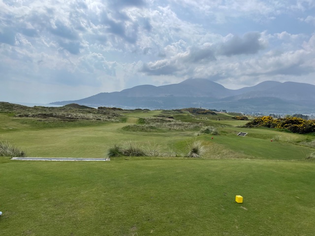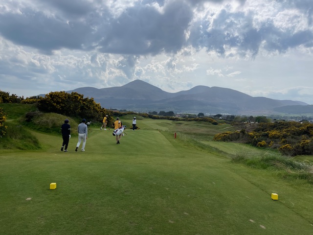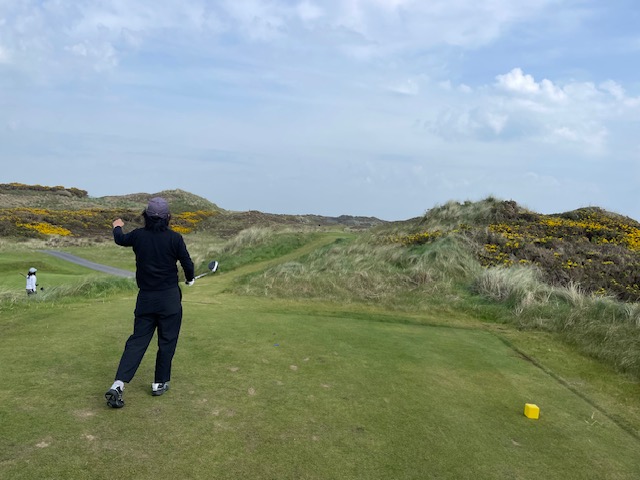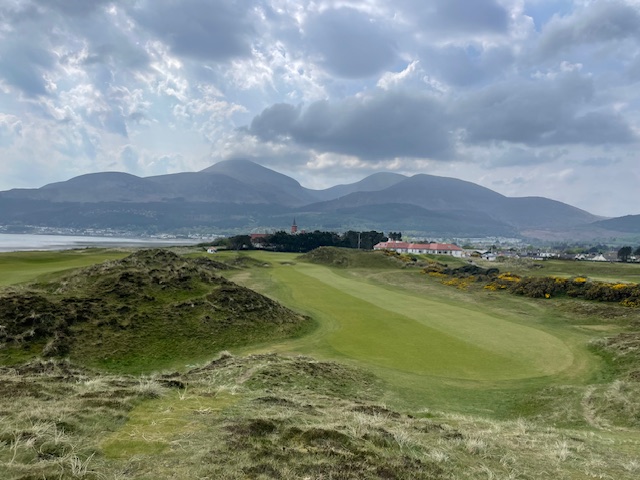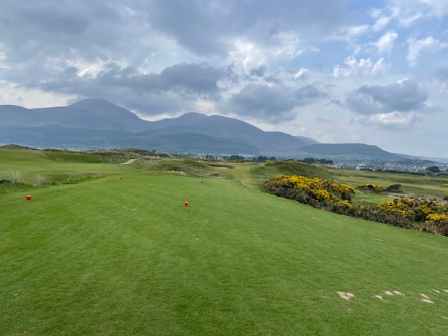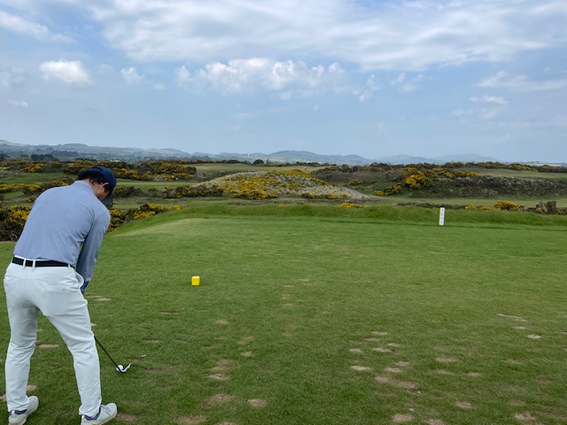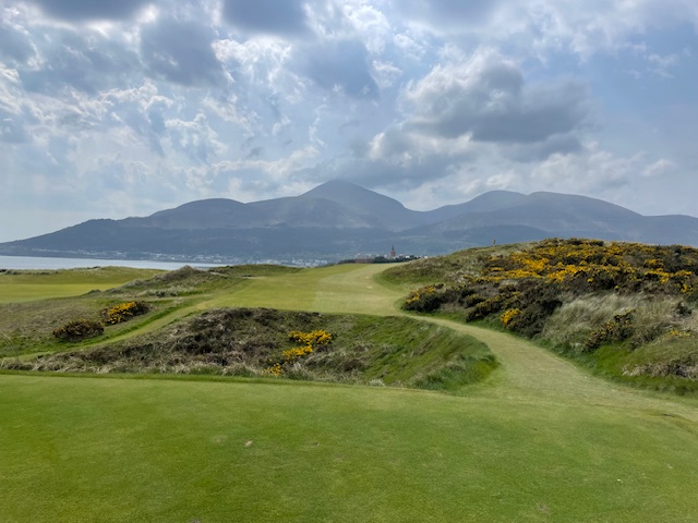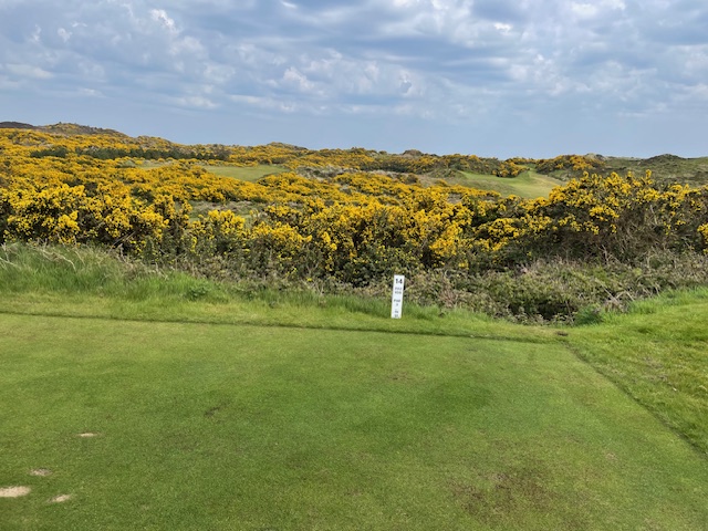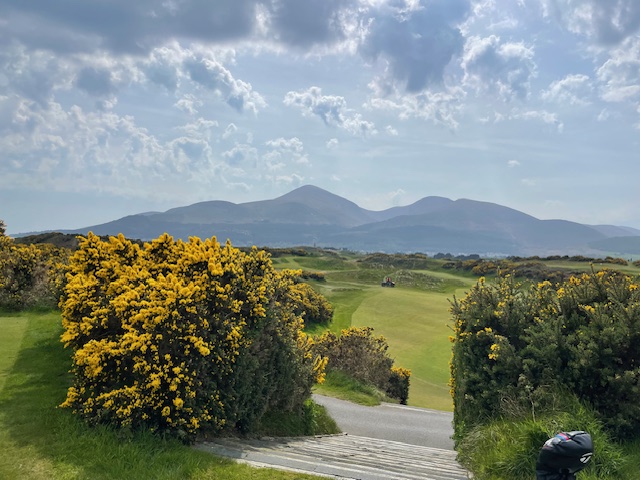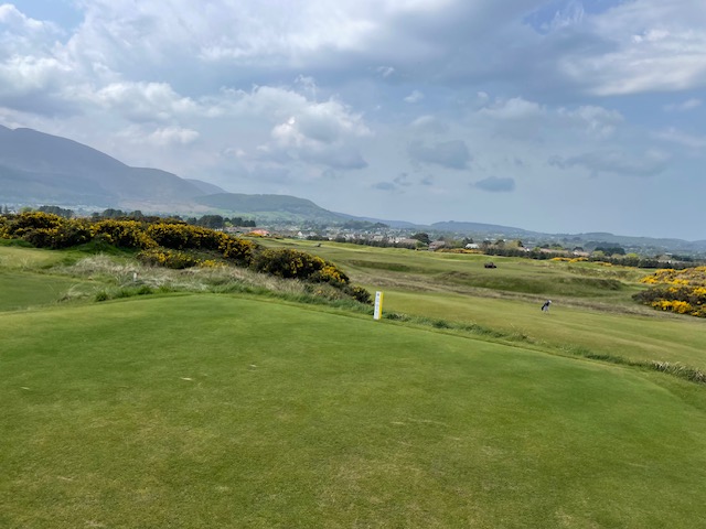 ロイヤルカウンティダウンの感想・・・・今の時期はゴースの黄色い花があちこちに咲き乱れ、干潟のような海とリンクスには珍しい山とのコントラストがとても美しいゴルフ場でした。かなり戦略性が高く、点で攻めていかないとスコアが出ません。ここもフェアウェイ脇のバンカーに入れたらどうにもなりません。マエシン、ついに念願のロイヤルカウンティダウンを廻れました。