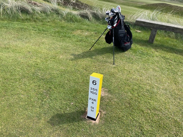 その後、パターを少々転がして、アウトから。前は空いていますが、スタート時間にならないと打てません。きちんとスターターの方がおられます。今日は黄色のティ6,641yから進行します。青は7,206y、白が6,925yです。