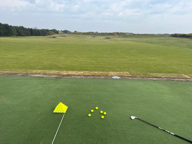 まずは、コーヒーブレイクです。ドラフトビアを頼みたかったのですが、11時からではないとオーダーが出来ないそうです。その後、カートに乗せてもらい、珍しくプラクティスレンジヘ。はい、黄色いボールがピラミッドのように積まれています。55球を打ちます。