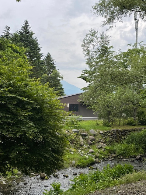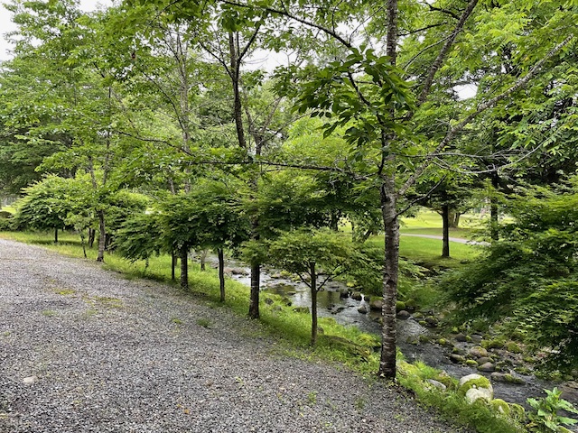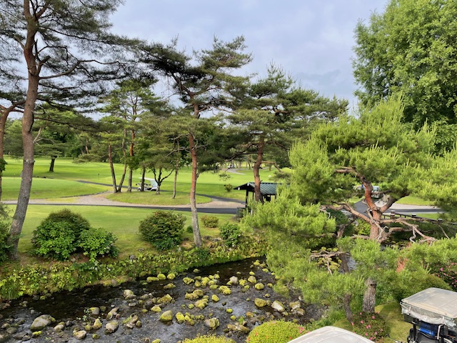 7時前に、H.Tさんからのレストランで待ってます!のメッセージが!おや、早いな!と感じながらも身支度してコースに向かいます。が、やはり、早すぎて(7時20分開始)入れない模様。前は入れてもらえたんですがね~とH.Tさん。確かに。少し、システムが変わった模様。しばし、皆で小川のせせらぎを聴きます。