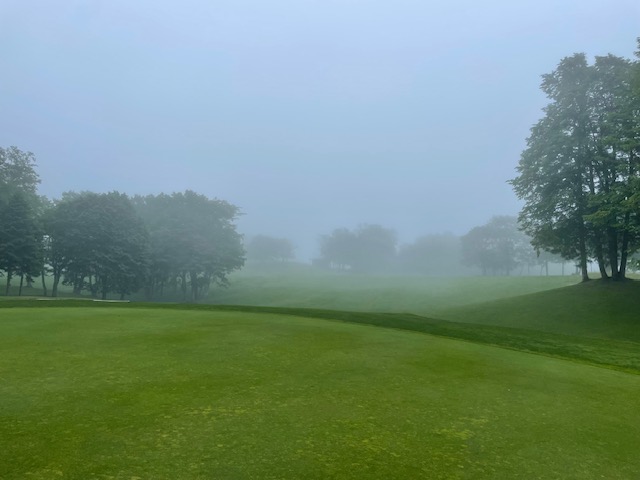 9番右ドッグのロングは、ドライバーはナイス。セカンドの5wが右へ。木があり、3打目は8アイアンでの転がしで奥に。2.3mを入れてナイスパー。