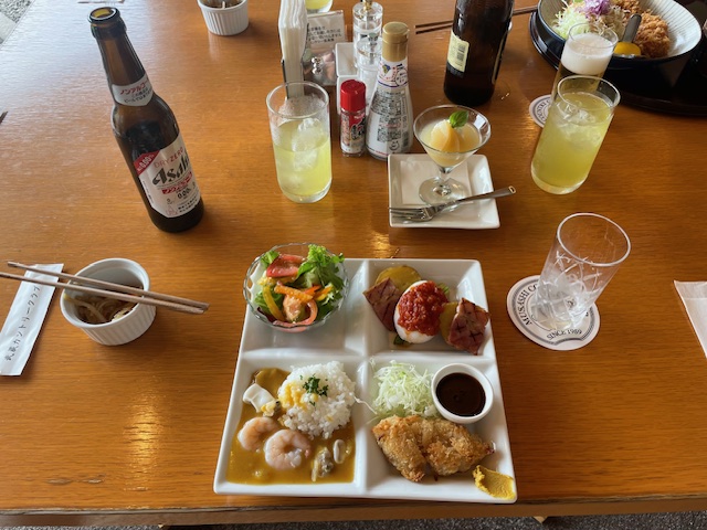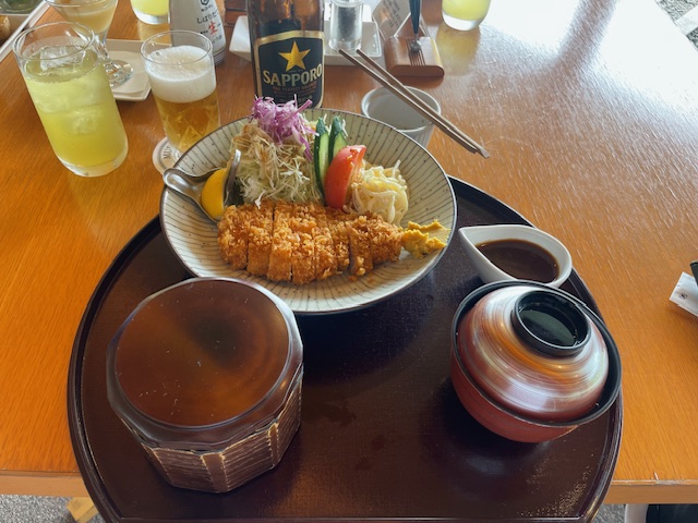 まずは、到着して、着替えから。半ズボンに履き替えます。で、レストランへ。3人で談笑しながら、ミーティングです。