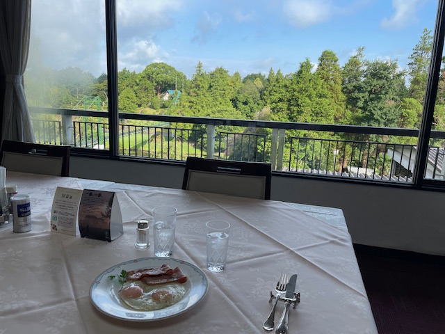 いつものようにベーコンエッグを食し、アウトから。