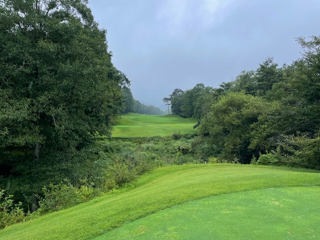 9番アウト3つ目のロングは、右ラフからのセカンドをチョロ。やっとのボギー。手前のカラーまでセカンドで飛ばしてきたH.Yさんが50センチに寄せてバーディ。