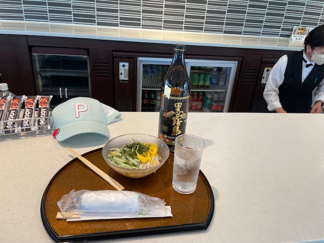 到着後、着替えて、スタートテラスで今日は黒霧島の水割りと昨日も食したソーメンを朝食としました。