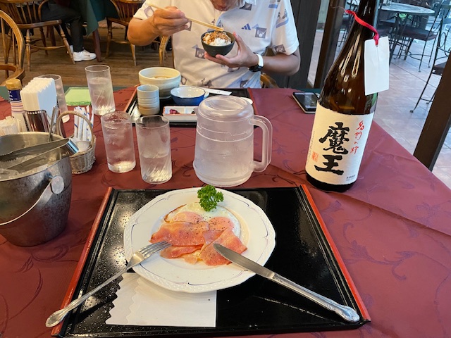 まずはレストランへ。今日も縁の方々に遭遇です。ベーコンエッグを食し、インから。