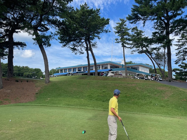 着替えて、スタート前に、フリーとのドリンクをいただき、スタート。今日はセルフデーです。アウトから。グリーンティから。