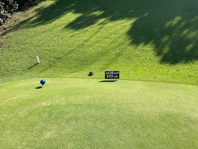 16番555yロングは、ドライバーは右ラフへ。傾斜地から3uで上手く打つ。残り136y追い風を9アイアンで打つもショート。ガクッ。も、ナイスアプでパー。J.Oさんもナイスパー。