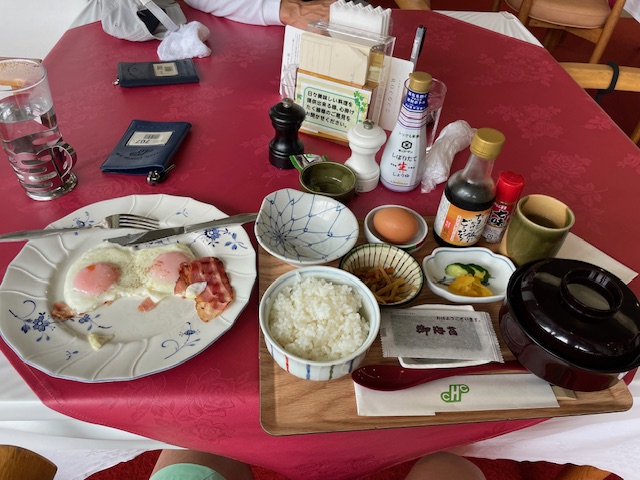 皆様方と賑々しくベーコンエッグと豚汁定食を食す。グーであります。スタートする折にちょっと雨が降ってきました。皆様方から「「天気は大丈夫です!」と言い切っていたけどこの予報を見た限り後半はダメそうだね」に心細くなる。