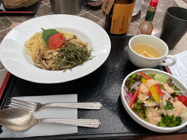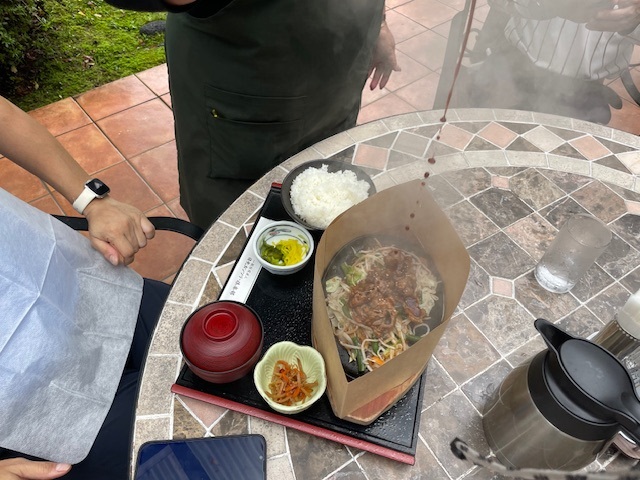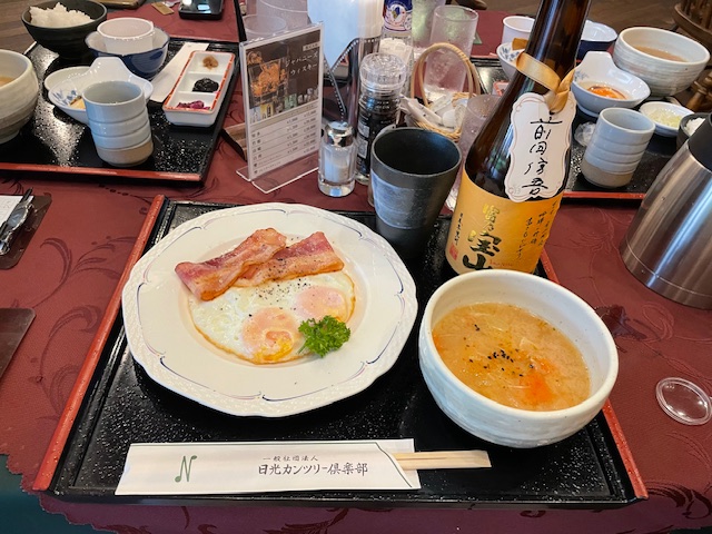 皆様と歓談しながら、朝食タイム。ベーコンエッグと豚汁です。