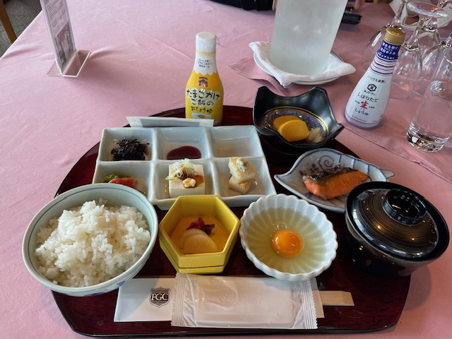 着替えて6時50分にレストランに行きます。7時オープンらしいですが、どうぞどうぞ!とのこと。これまた素晴らしい!和朝食をいただきながら、お誘いいただいたT.AさんとK.Tさんと談笑会です。