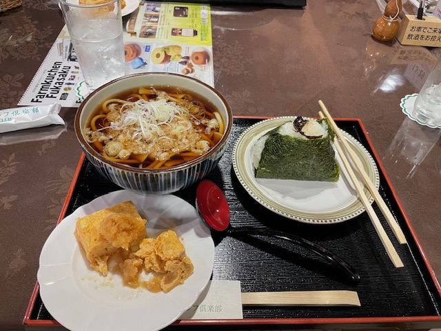 ランチは、かけうどんとおにぎり。