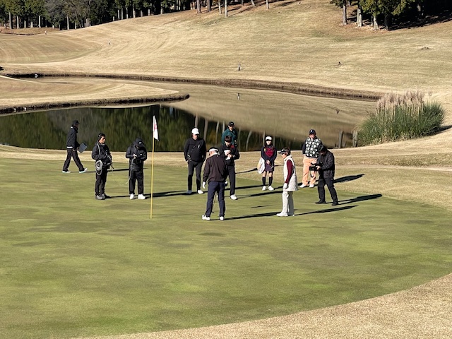 オナーの塩谷プロが左カラーへ。マエシンはPWで手前7mに1オン。続いてY.Kさんも9アイアンで1オン。マエシンとY.Kさんのバーディトライは入らずも無難にパー。