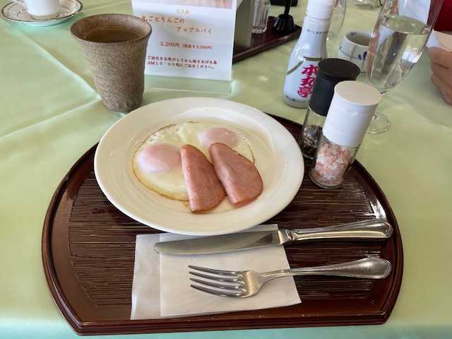 集合写真撮影後、レストランへ行き、椎名理事長と中川支配人とハムエッグを食しながら、談笑タイムです。
