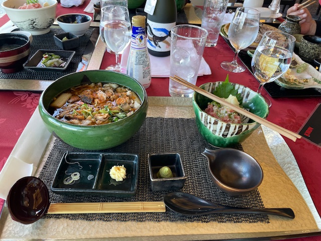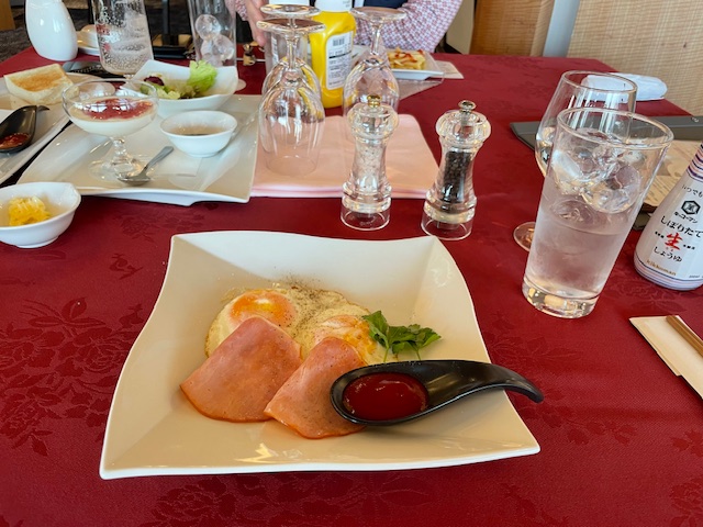 到着後、レストランへ。ボトルを入れて3人で飲みます。ハムエッグを食しながら。
