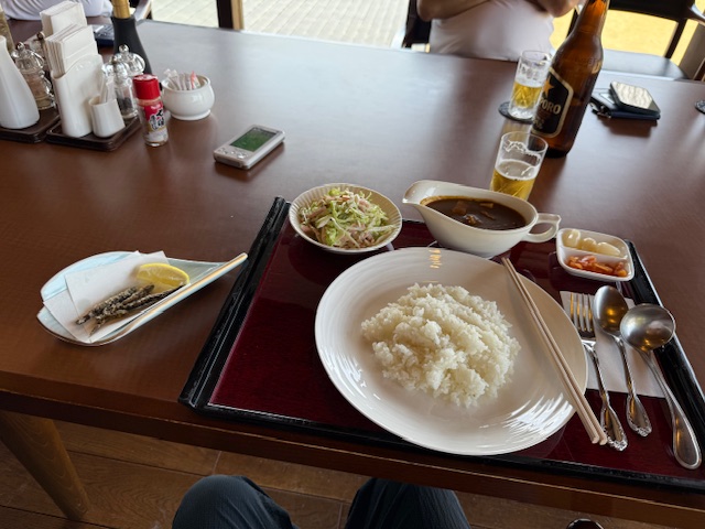 ランチは、ポークカレーハムサラダ付きとドジョウ揚げをいただく。