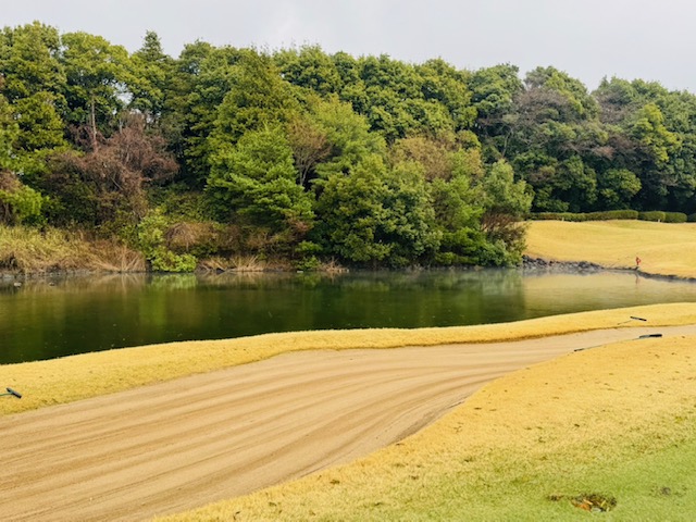 18番ミドルは、ドライバーは左ラフへ。3uで2オンを狙うも手前の池にジャブン。ドロップして4オン。ダボ。